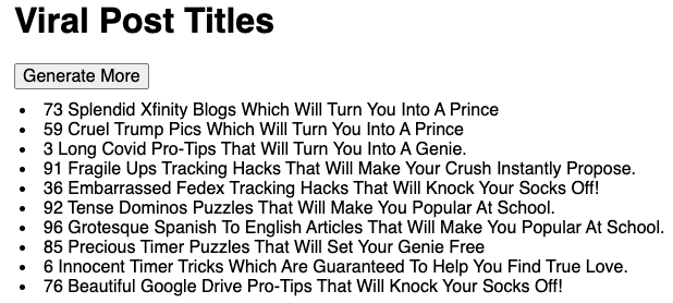 - You can go to the link and you'll see the code they put behind it. It just, you know, pulls together random words. Look at some of these ones, 85 precious time of puzzles that will set your genie free 92 tents dominoes pizza puzzles that will make you popular at school. Like it just randomly makes these up. I'm sure I used to see articles like this on Buzzfeed and stuff. You see it. It was just junk. And anyway, this is, folks, this is a joke. Or is it?