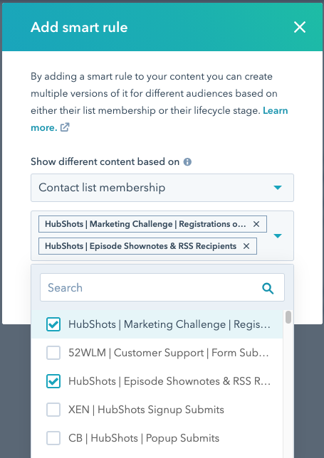 - All right, so I just, we've got a bunch of screenshots, again, if you need the show notes, just sign up at hubshots.com/subscribe. Get the show notes in your inbox every Friday morning. Anyway, the reason, the value for doing that is that you get all these screenshots. However, if you're listening to this in the car, let me just explain. In the email drag and drop builder, this is drag and drop builder, by the way. I don't think it works particularly well in the old style custom email builder, but you should be using the drag and drop builder, if you can. Anyway, it's so simple because every object, sorry, every module now has on the little More button, an Add Smart Rule. In fact, the only one that I don't think has is the footer module, which makes sense, you don't want to be swapping that in and out. But yeah, it's got this Add Smart Rule, and like we went through last show, it's really easy to use, you build up your rules. Difference between landing pages or web pages versus emails, of course, is that you have a smaller set of categories. You've basically got contact lists or lifecycle stages. Obviously, they don't have things such as location, where the person's visiting from, things like that, which you would on web pages. So yeah, we've gone through a bunch of them and some examples there. I really like how contactless membership, you can draw, you can create multiple lists, right? So it's not as though you only have to select one list, you can choose, got a screenshot about that. Then managing the smart rules is really easy. That's the same format they've always had. So this has been here, you know, even when they had rich texts. But everything, video, images, in fact, even dividers you can have a smart rule on a divider. So everything's there, got a few examples. And then of course, once you add the smart rule, got another example in the show notes here, it's just really easy. It's highlighted with this is a smart rule. So very easy to use, very easy to see, which has a smart rule applied to it.