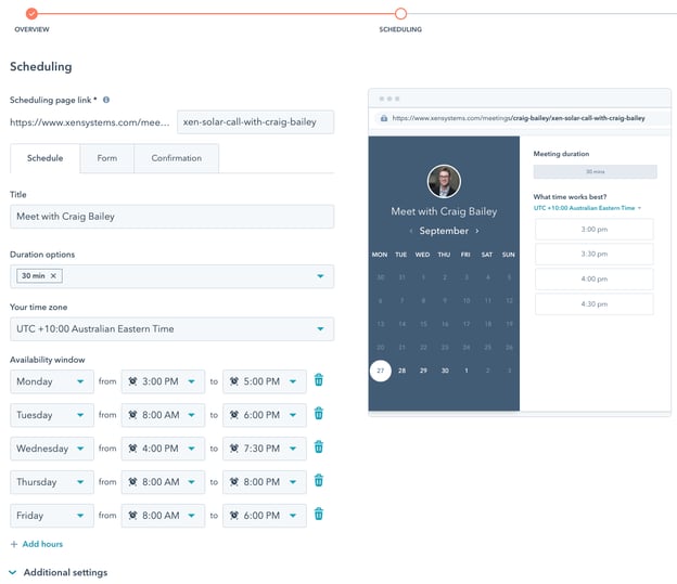 Worth mentioning you can create numerous ‘Meetings’ (or ‘Scheduling pages’ as HubSpot refers to them as) and embed them on different pages, or share in different emails. For example I have Meeting options set up for different brands, and different durations (eg 15 min, 30 min and 60 min).
